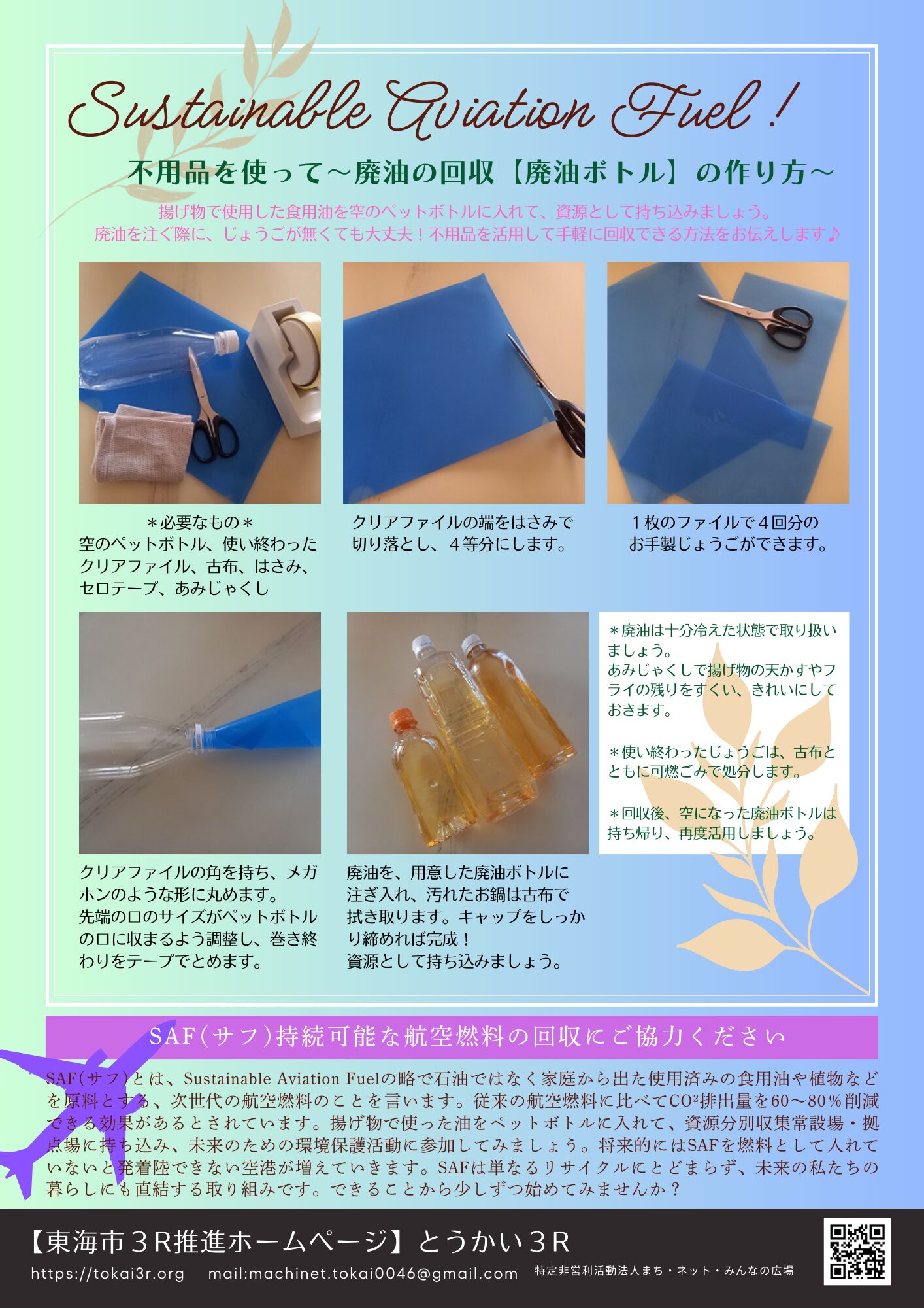 【リサイクル・資源】不用品を使って~廃油の回収方法・廃油ボトルの作り方~ 2026年2月8日 最終更新日時 : 2026年2月8日 とうかい3R 廃油を資源として活用しませんか?手軽に回収できる方法をお伝えしています。SAF(サフ)持続可能な航空燃料の回収にご協力ください。詳しくはこちら Post Views: 7