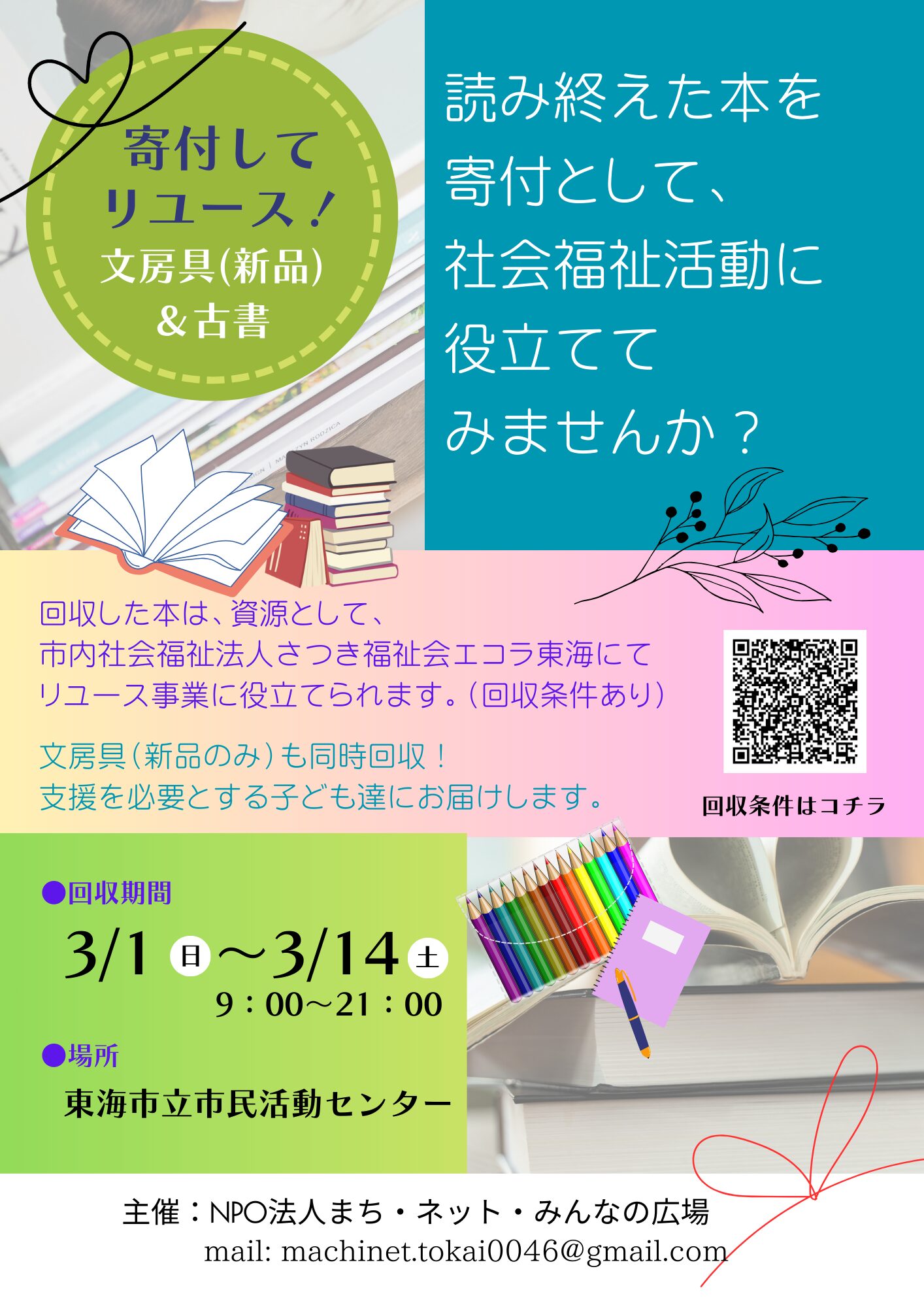 東海市立市民活動センターの市民交流プラザまつり開催に伴い、ご家庭で不用となった古書や文房具(新品のみ)の回収と、フードドライブを開催します。